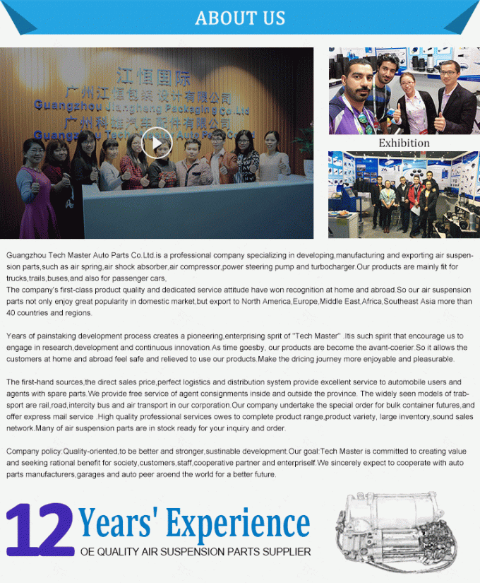 गुआंगज़ौ टेक मास्टर ऑटो पार्ट्स कं लिमिटेड चीनी अग्रणी ऑटो निलंबन भागों आपूर्तिकर्ता में से एक है। हम विशेष रूप से मर्सिडीज-बेंज, बीएमडब्ल्यू, ऑडी के लिए एयर सस्पेंशन शॉक, एयर सस्पेंशन स्प्रिंग, एयर सस्पेंशन कंप्रेसर, पावर स्टीयरिंग रैक, पावर स्टीयरिंग पंप, कूलिंग फैन, एयर सस्पेंशन क्रिम्पिंग मशीन, एयर सस्पेंशन रिपेयर किट और आदि प्रदान करते हैं । , लैंड रोवर, लिंकन, बेंटले, वीडब्ल्यू फेटन, लेक्सस, टोयोटा और फोर्ड। हम भी भारी ट्रक और औद्योगिक वसंत के लिए हवा वसंत के अन्य मॉडल की आपूर्ति।